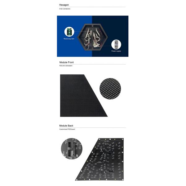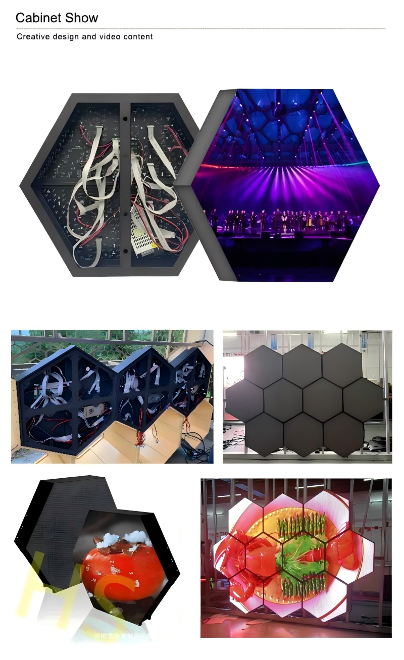 by high definition indoor 2mm 2.5mm 3mm 4mm pixel pitch, each hexagon can work independently to show clear image or video, or work together to form a pattern to show creative contents.